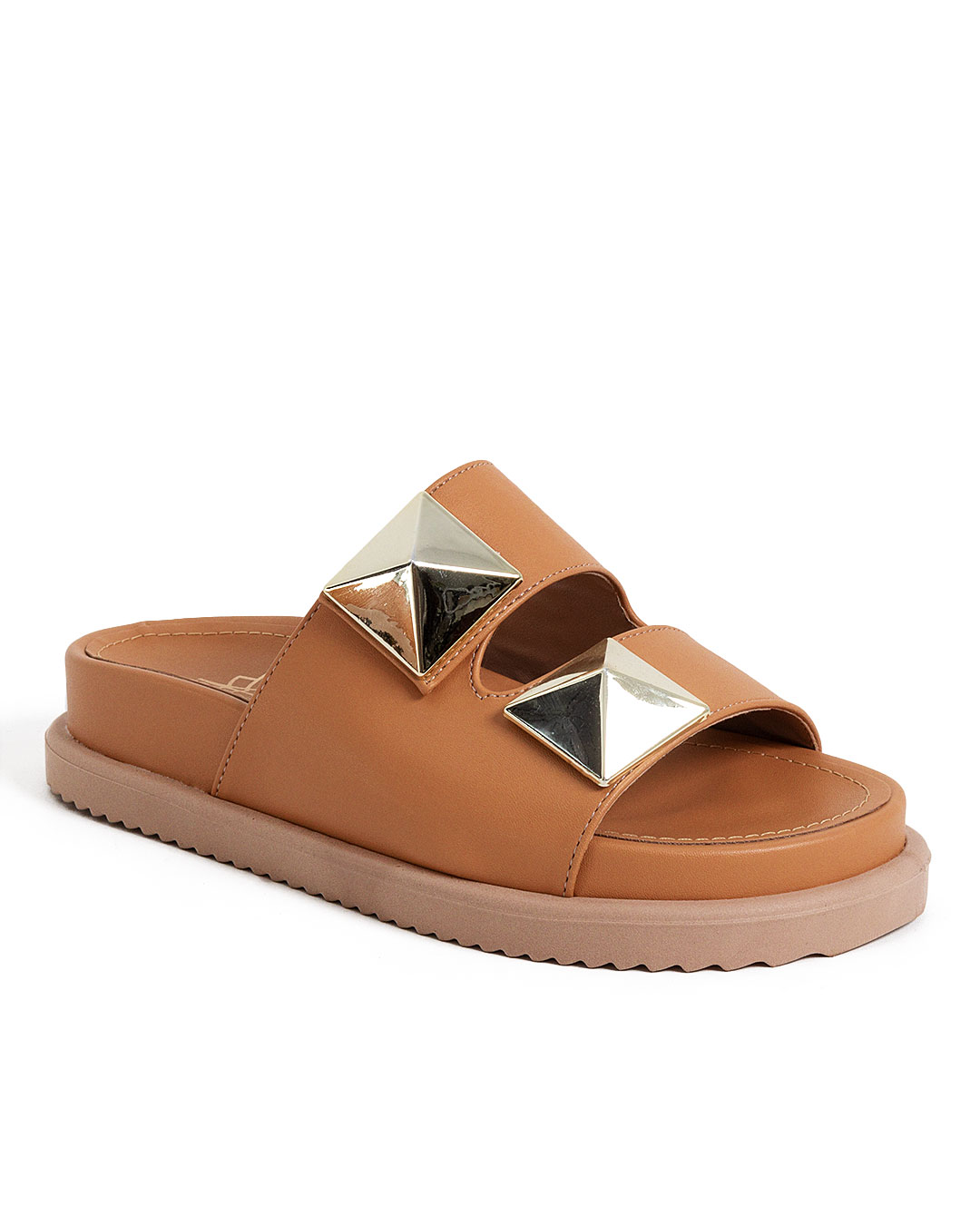 Estas sandálias marrons de sola grossa combinam conforto e estilo contemporâneo. Com duas tiras adornadas por detalhes metálicos tridimensionais em forma de pirâmide, elas oferecem um toque moderno a um design clássico. Perfeitas para quem busca um visual elegante e diferenciado.