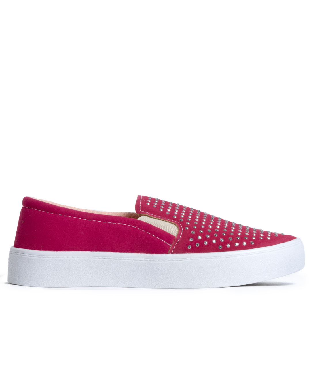 Descubra o conforto aliado ao estilo com estes sapatos slip-on vermelhos, adornados com deslumbrantes tachas e um elegante solado branco. Perfeitos para adicionar um toque de cor e brilho a qualquer look casual.