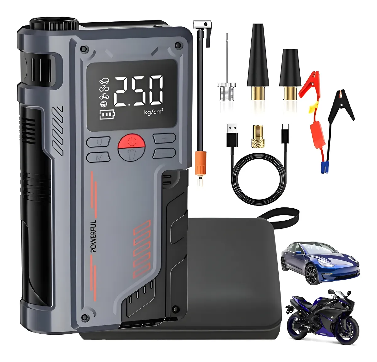 O auxiliar de partida tem bateria interna robusta de 16800mAh e oferece pico máximo de 3000A de corrente para partidas rápidas, tornando-o adequado para veículos com motores variados. O compressor embutido complementa a funcionalidade, permitindo encher pneus sem necessidade de equipamento extra.