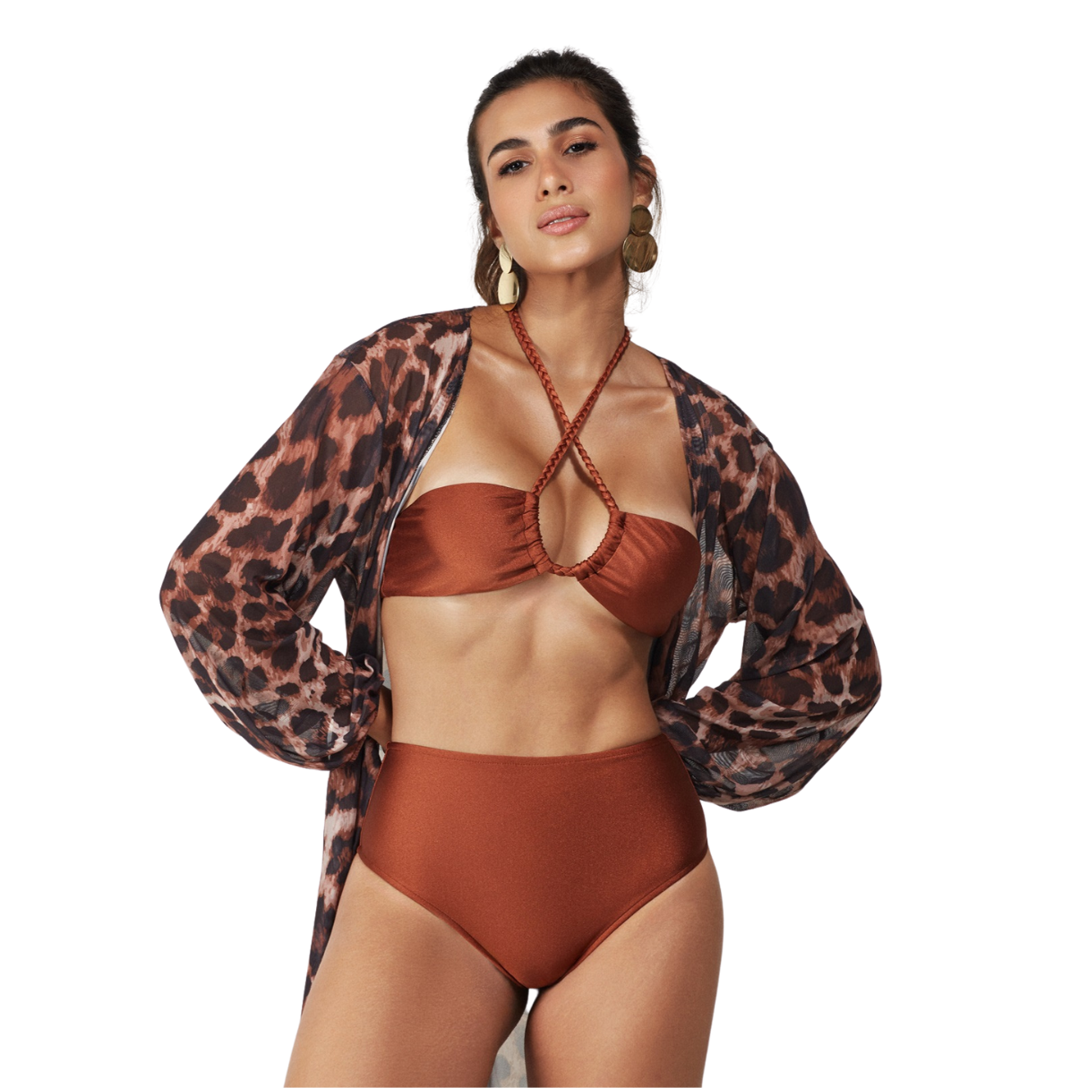 Top Faixa com abertura frontal, alças trançadas, com amarrações versáteis.