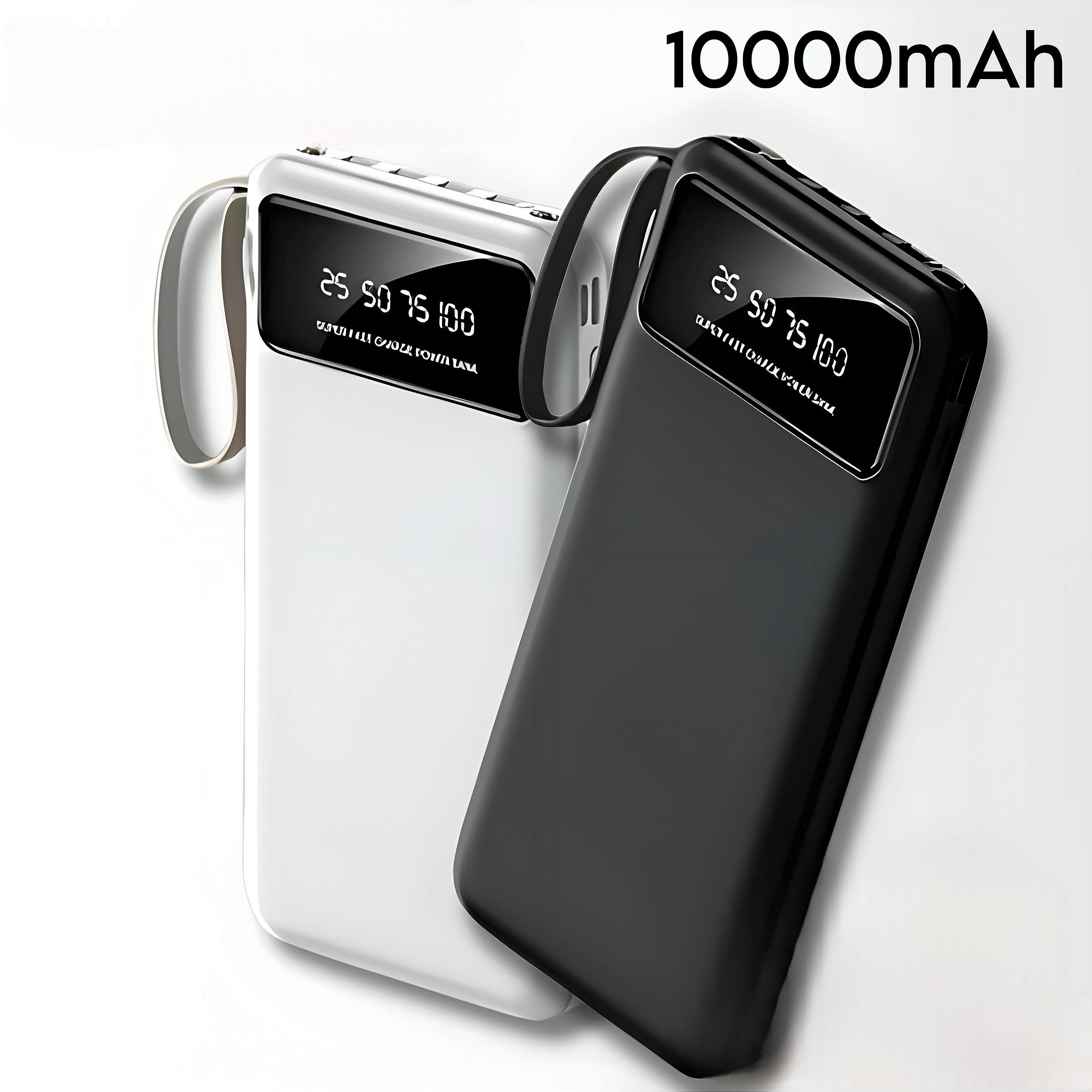Carregador portátil com capacidade de 10.000mAh e corrente de 3.1A, oferecendo um carregamento de alta velocidade. Bateria de padrão nacional e material externo a prova de fogo. Acompanha 4 cabos destacáveis em sua traseira, sendo 1 Lightning, 1 Tipo C, 1 Micro USB e 1 USB 1/2. Também apresenta 3 entradas: 1 USB-A, 1 USB-C e 1 Micro USB. Bateria de alta qualidade e longa duração.