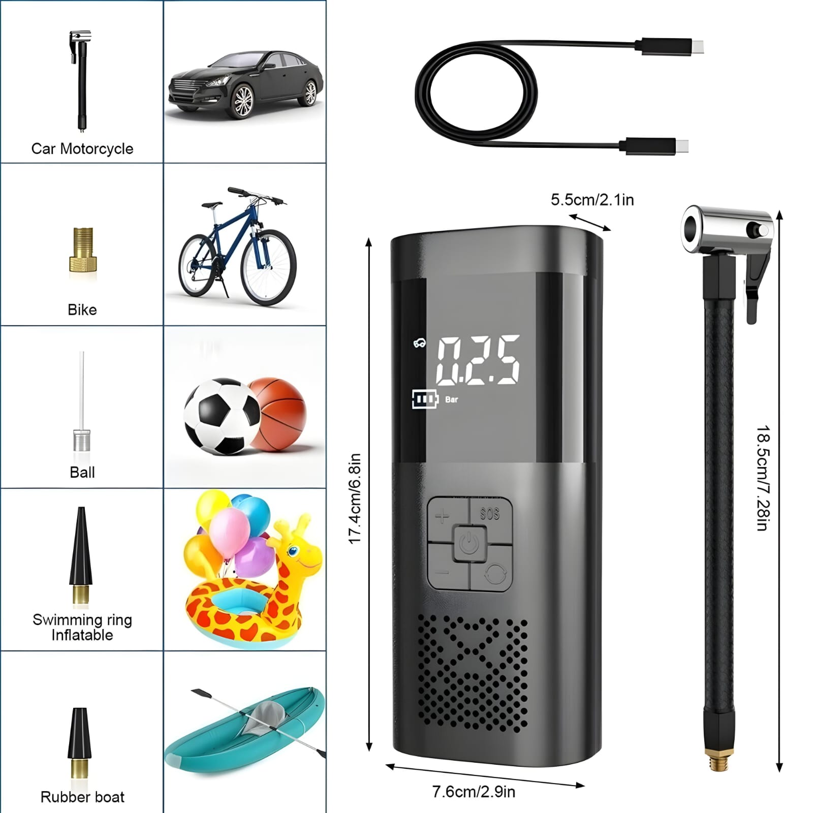 Compressor de ar portátil elétrico 3 em 1, ideal para levar em seu automóvel por ser um produto útil e necessário em diversas situações. Pode ser utilizado para inflar pneus de carros, motocicletas, bicicletas, bola e pequenos brinquedos infláveis. Também pode ser usado como calibrador de pneus e lanterna, garantindo a segurança em emergências noturnas ou lugares isolados.
