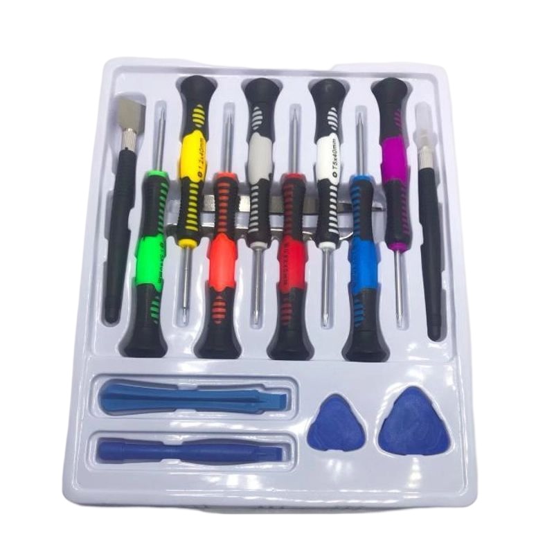 O kit inclui 8 chaves de fenda com pontas diferentes, 2 ferramentas de abertura triângulo, 2 ferramentas de abertura de alavanca, 2 pinças, 1 raspador e 1 estilete.