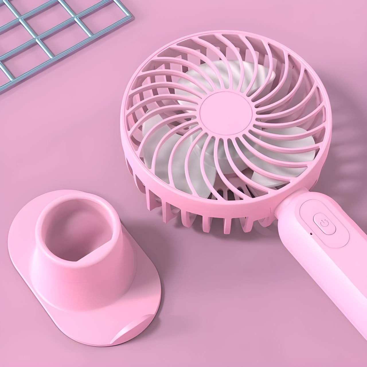 Mini ventilador super prático, é desmontável e pode ser utilizado tanto como ventilador de mão quanto de mesa. Produto ideal para secar maquiagem ou em ambientes de trabalho.