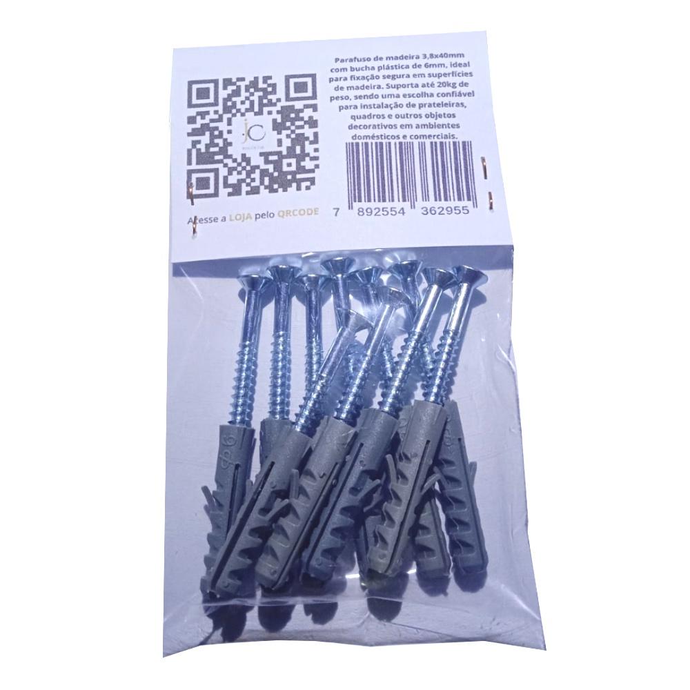 Contém: 10 unidades de parafuso de madeira 3,8x40mm + 10 bucha plástica 6mm suporta até 20kg
