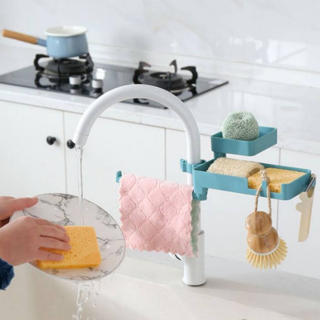 Suporte porta sabão, esponja e pano de pia adaptável à torneira.